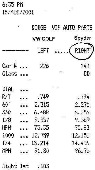 This was my best overall time and I was very happy with the RT. 0-60 ft was still weak, I wasn't revving high enough. The MR2 was modded. I could clearly hear his BOV even when he was behind me. He had a better time but with my RT I beat him down the track, which was a real thrill since I felt like it had been a pretty good race.