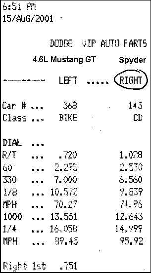 Terrible RT - could have gotten a Big Mac at a drive through quicker than this. I also had my 200 pound brother in the car. But I still smoked the Stang, and he wasn't too happy about it. You can see how he beat me to 60ft (which proves what a crappy launch I had) and I had already pulled him in at the 1/8. Glad to waste this guy, but not a pretty run for a VR4.